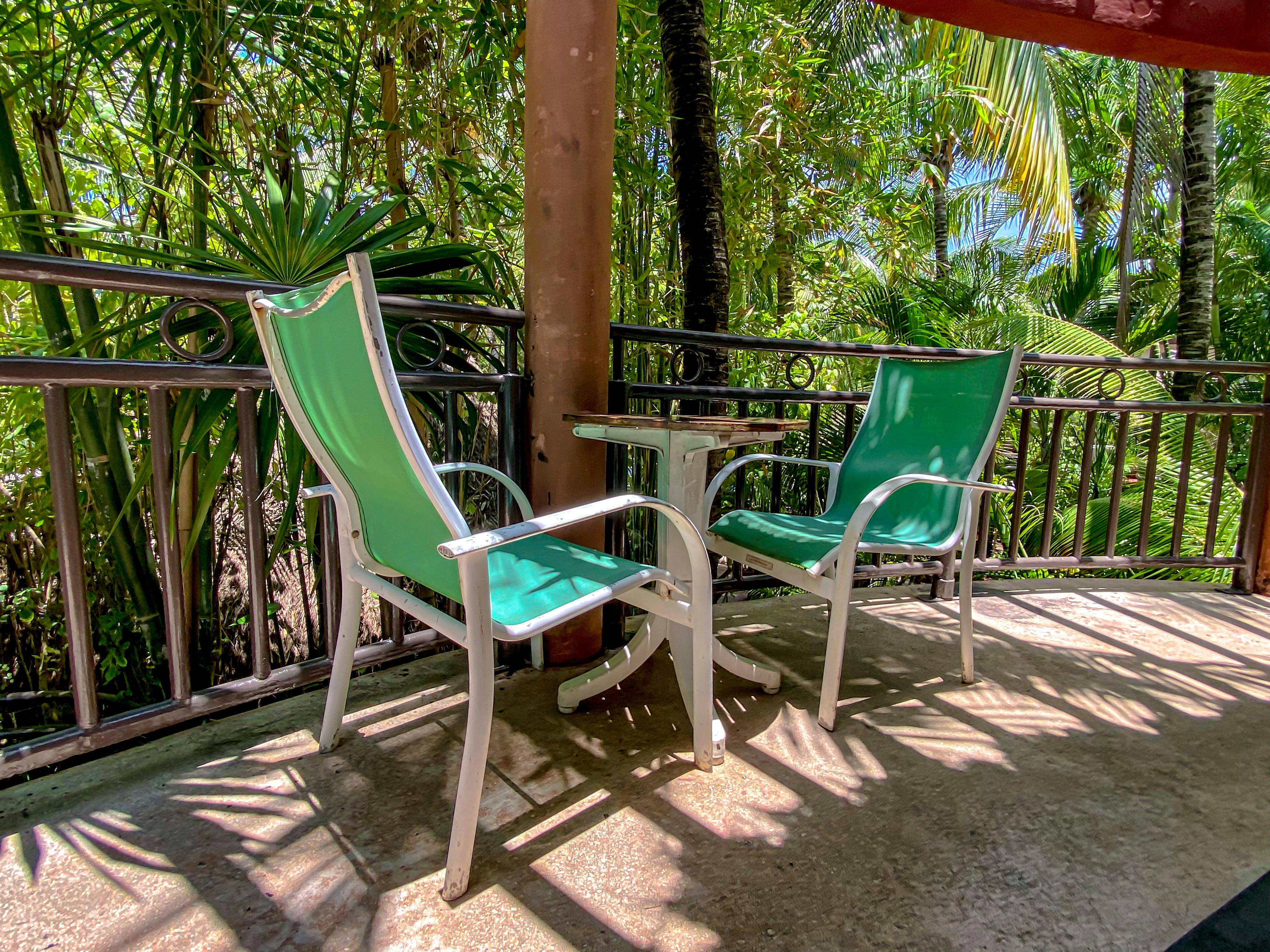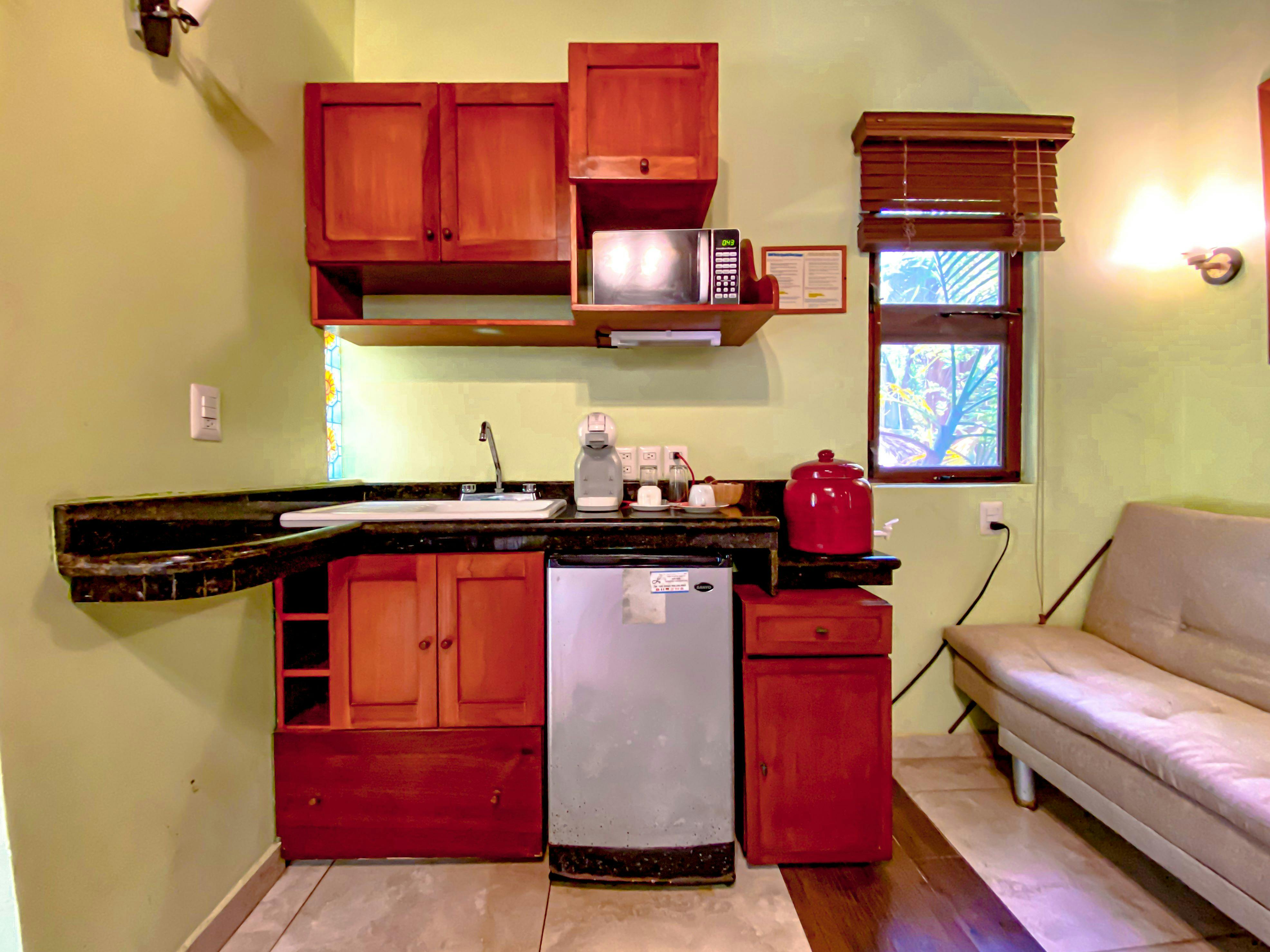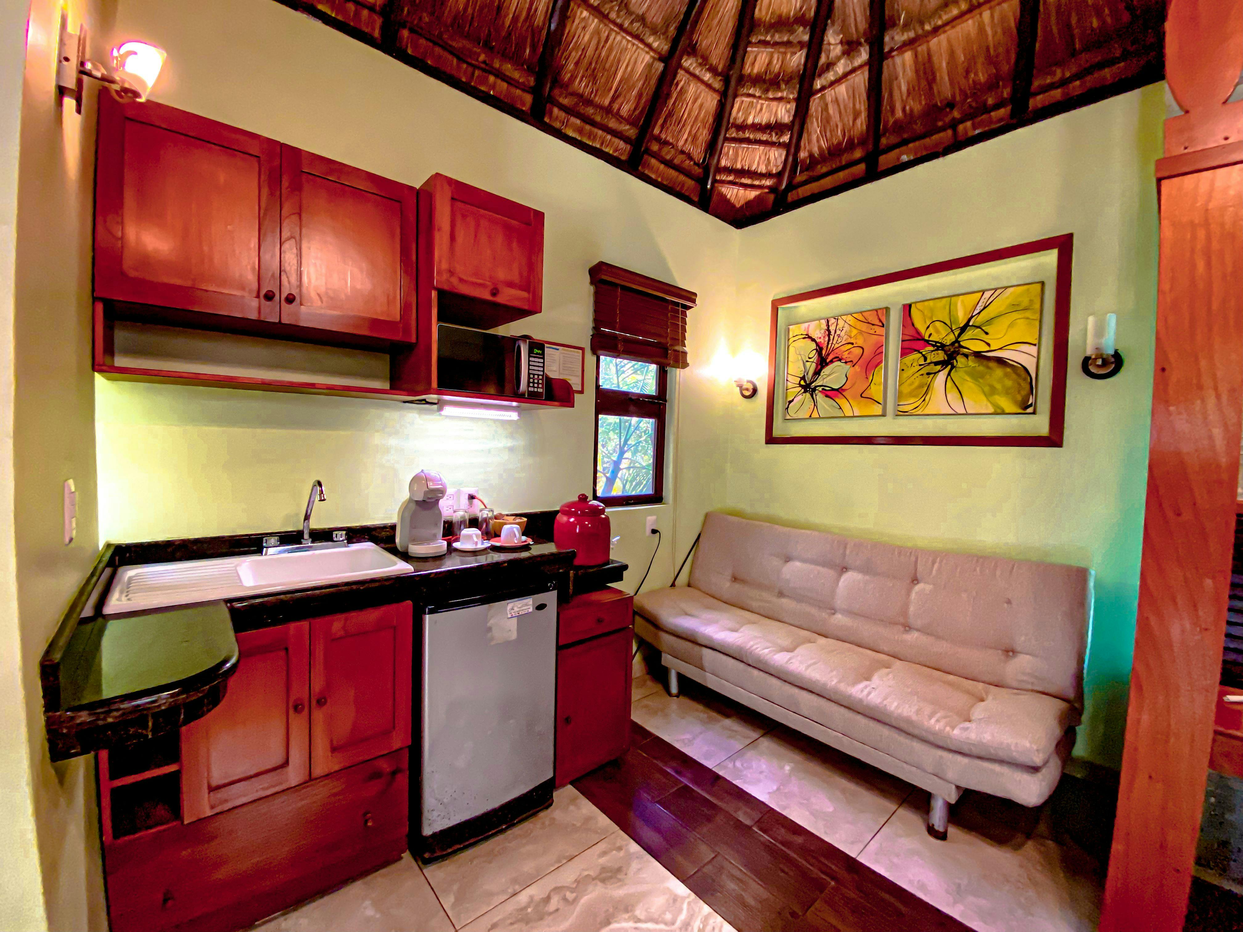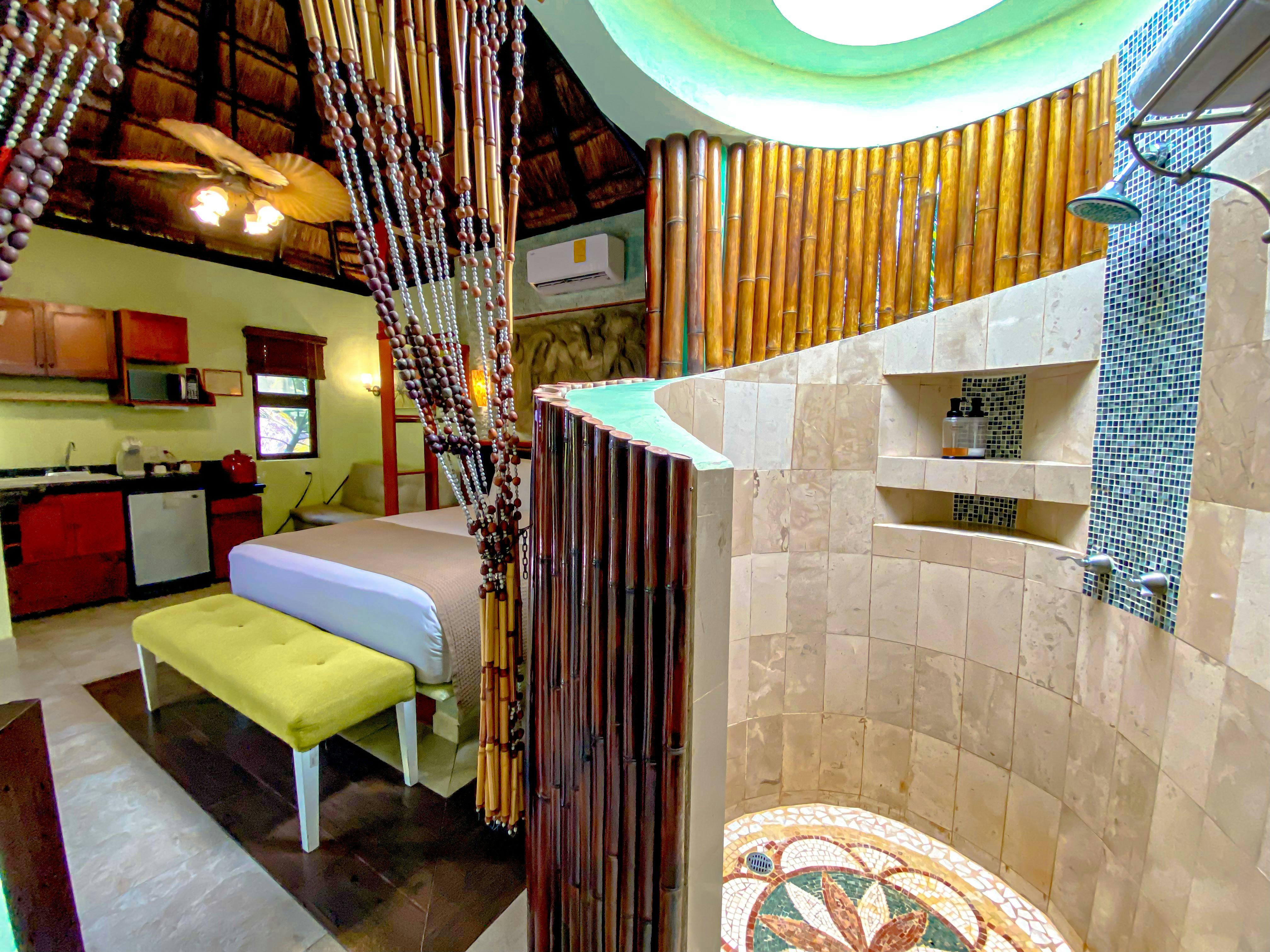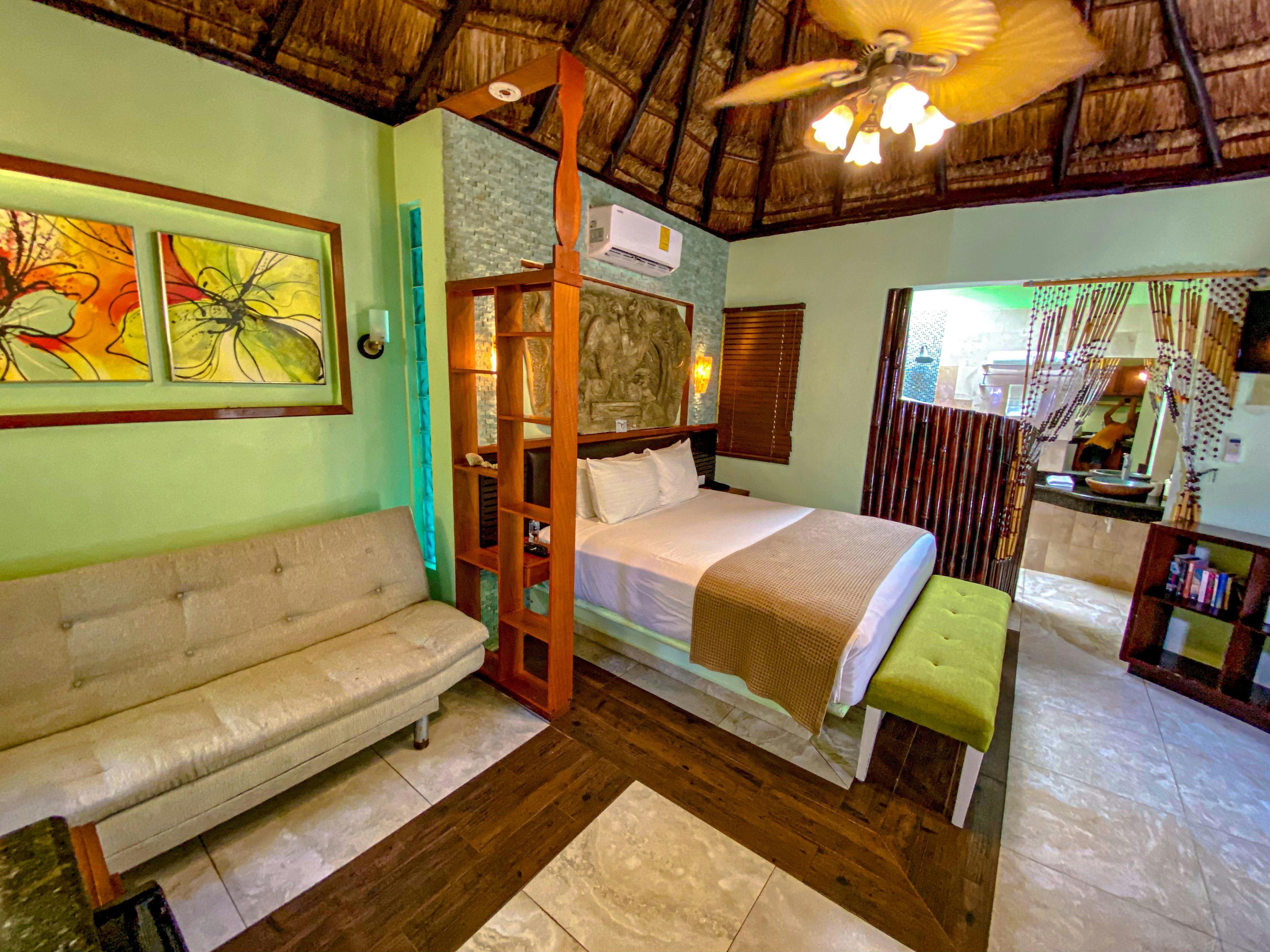 Cómodos bungalows de estilo rústico que ofrecen una cama queen size. Aire acondicionado, ventilador de techo, televisión por cable, terraza, secadora de cabello, internet inalámbrico gratuito y cafetera. Vista al jardín.